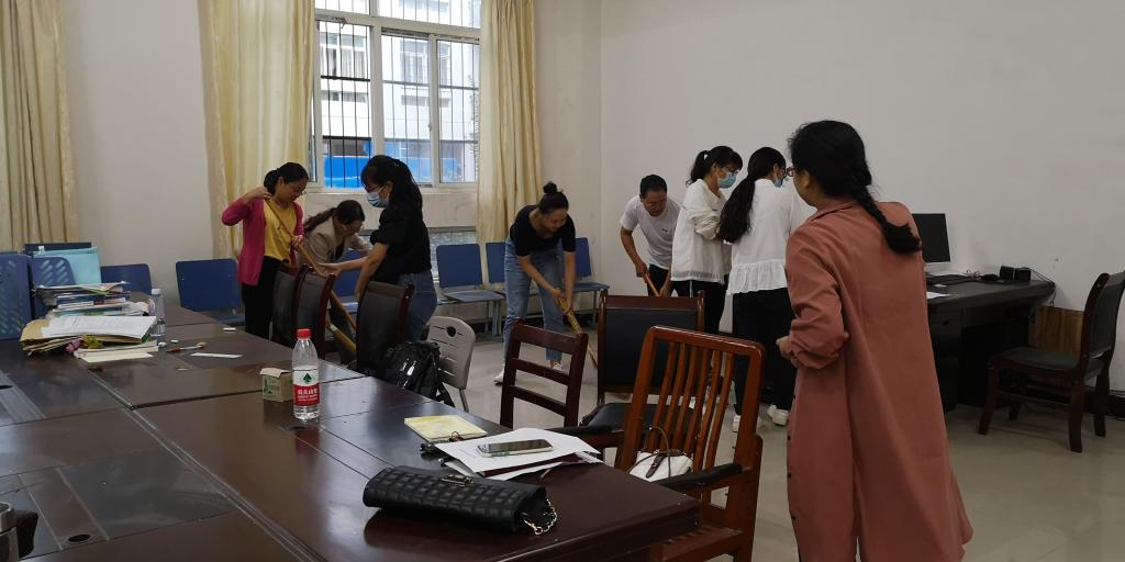 27日上午,同志们带上扫帚、拖把等工具来到教师办公室。虽然劳动量较大,任务重,但大家不怕脏、不怕累,分工协作,忙得热火朝天。同志们擦窗、擦桌、擦椅,打水、扫地,收拾、清理,相互配合,劳动场面和谐而热烈。经过近两个小时的辛苦劳动,同志们将整个办公室打扫得一尘不染,灰走尘落,窗明几净。