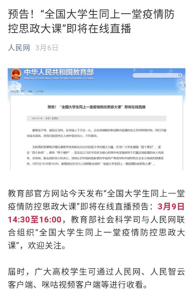 思政课部接到教育部将在3月9日下午开展“全国大学生同上一堂疫情防控思政大课”活动的通知,积极响应号召,各个思政课任课教师着手安排,保证了全院所有大一学生疫情防控学习。