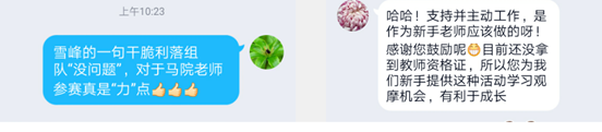 在5月15日QQ电话会议上,5个参赛队共10位教师都毫无怨言地接受了组队安排。当问及去年下半年新进教师陈雪峰对组队参赛有没有问题时,她的一句干脆利落的“没问题”!散发出满满的正能量,让在场的每个人都受到了感染。