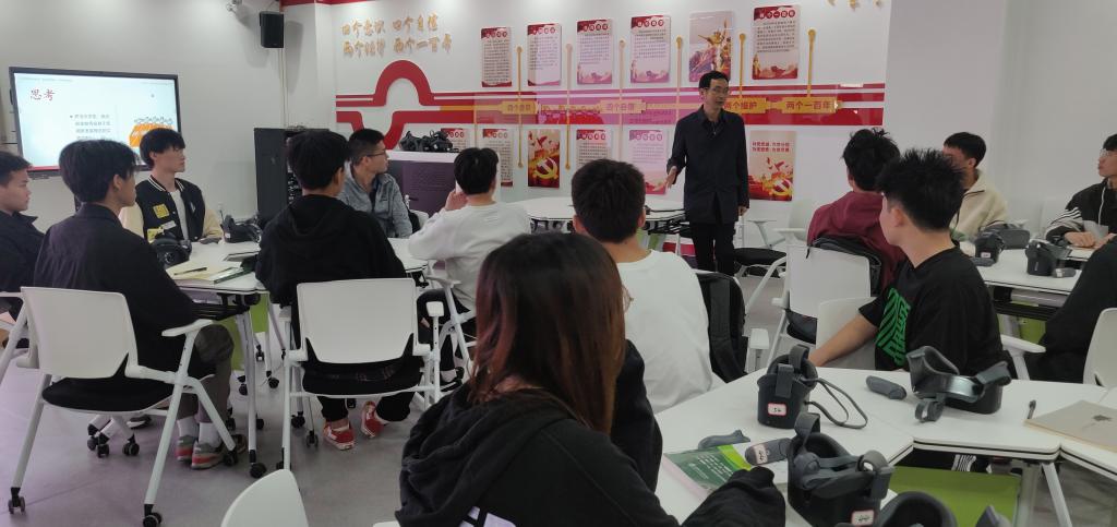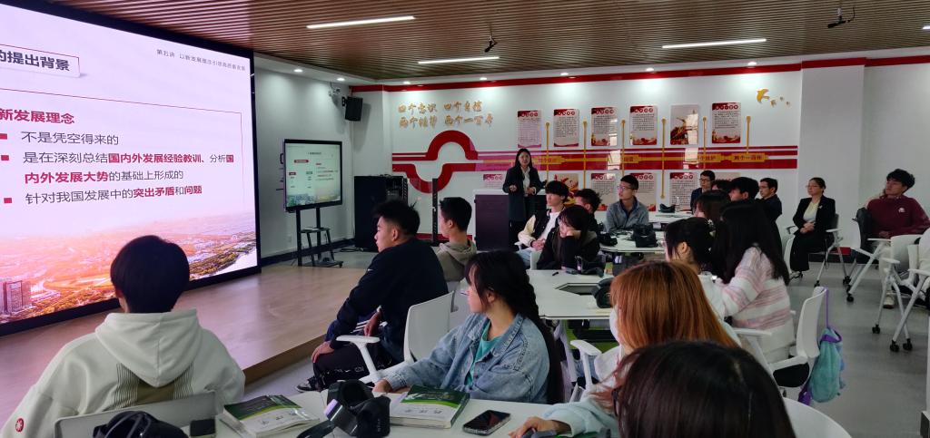 本次课由马克思主义学院青年教师樊金星主讲,她主讲的题目为《以新发展理念引领高质量发展》。在课堂上,樊老师将VR运用其中,同学们通过VR身临其境感受到自己家乡在脱贫攻坚前后的对比,更加清晰认识脱贫攻坚的重大意义,明白中国共产党锚定消除绝对贫困的底线目标,认识到中国共产党是带领中国人民走向共同富裕的有力保证,深刻领会到中国共产党领导和中国特色社会主义制度的政治优势。其后,樊老师从新发展理念的内涵即创新、协调、绿色、开放、共享五个方面一一进行了讲解,并结合随州和网络爆火的淄博优秀做法,帮助同学们更加具体理解新发展理念。