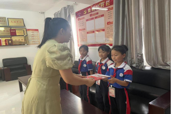 淅河镇小政教处主任凡老师精心安排了来自六个年级的优秀学生代表参与本次座谈。学生们积极踊跃发言,畅谈自己在《道德与法治》课上的收获,让我们看到了德育工作的重要性。孩子们热情分享自己从课堂中,从一次又一次的社会服务中所收获的幸福与快乐,尤其提到很多公司和爱心人士对学校和自己的关心与帮助,未来自己也要努力报效社会的时候我们都被深深触动。最后,我们给几位优秀的孩子们赠送了红色经典故事读本,孩子们也送出了最真诚的少先队队礼。